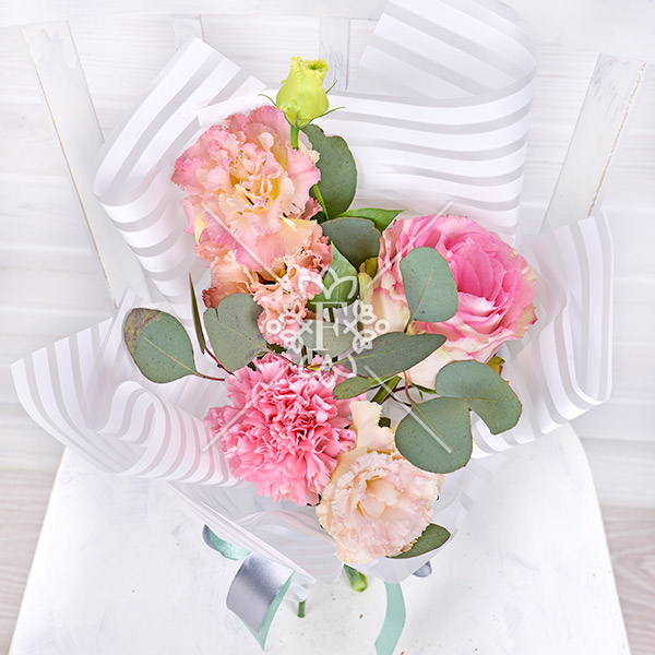 Эустома розовая- 1 шт., гвоздика розовая -1шт., роза розовая – 1шт., зелень декоративная (эвкалипт), упаковка, лента.